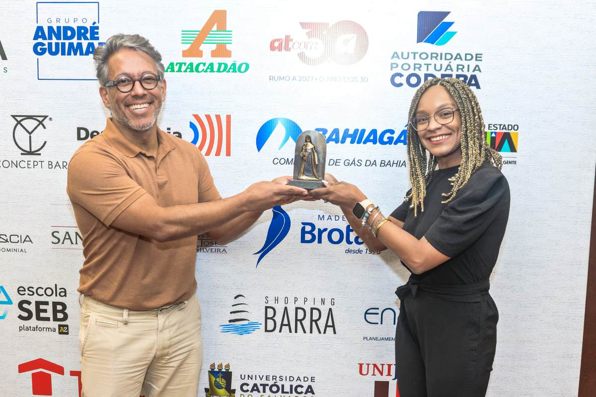 Shopping Barra recebe o troféu do Prêmio Master Marketing Empresarial 2025, inspirado em Santa Dulce dos Pobres, do artista plástico Aless Teixeira. Imagens: Robson Bonfim.